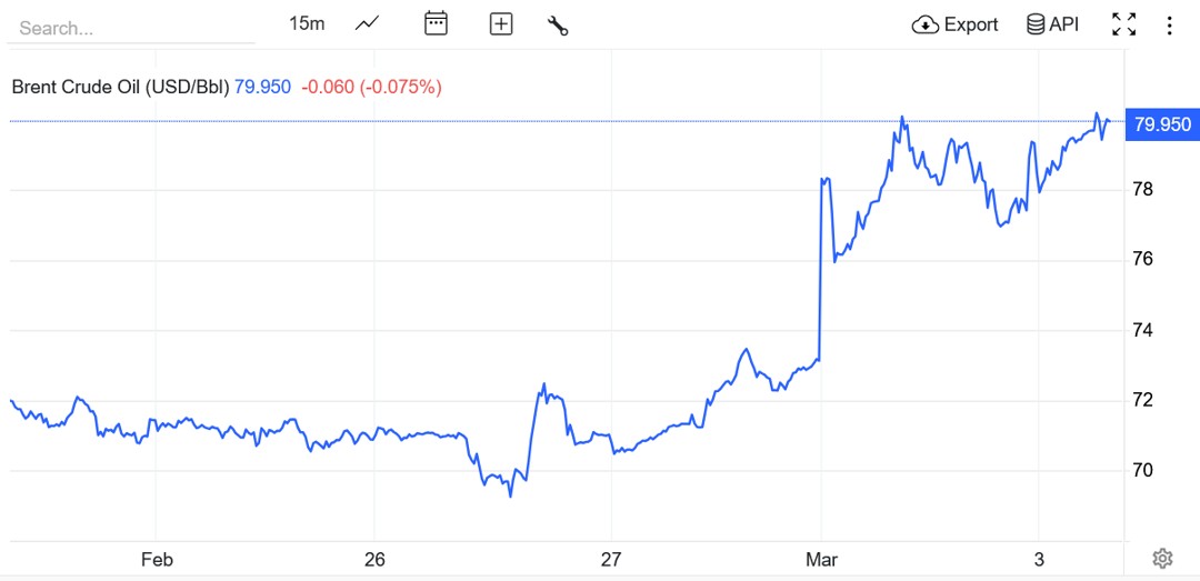 A Brent nyersolaj ára kedden reggel egy időre ismét átlépte a hordónkénti 80 dolláros értéket.
