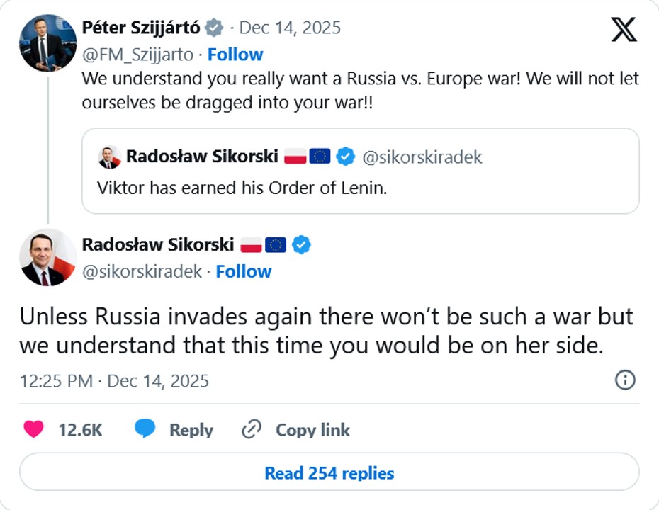 Az X-en keveredett szóváltásba Radosław Sikorski lengyel külügyminiszter és magyar kollégája, Szijjártó Péter. A lengyel külügyér Orbán Viktor magyar kormányfőnek azt a hozzáállását kommentálta, hogy az Európában levő orosz vagyon elkobzása hadüzenetnek felel meg, és az európai jogállamiság végét jelenti.