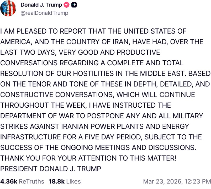 „Arra utasítottam a hadügyminisztériumot, hogy halasszon el minden lehetséges csapást iráni erőművek és az energiainfrastruktúra ellen öt napos időtartamra a jelenleg is zajló találkozók és megbeszélések sikere érdekében”