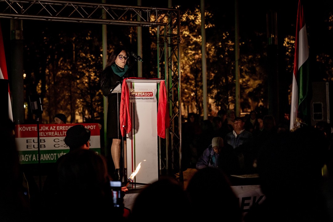 feliratú molinó mögött vonulva nagyon látványos fáklyás menettel a Jókai utca, Podmaniczky utca, Bajcsy-Zsilinszky út, Bank utca útvonalon érkeztek a Szabadság térre, a Magyar Nemzeti Bank (MNB) és a Bank Center közti területre, ahol Z. Kárpát Dániel azt mondta,