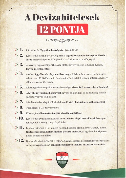 Az Igazságügyi Minisztériumhoz vitték a károsultak a devizahitelesek 12 pontját, hogy azt a november eleji tüntetésen az érintettek közfelkiáltással megszavazták – közölte a tárca épülete előtt tartott sajtótájékoztatóján Z. Kárpát Dániel.
